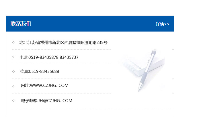 地址:常州市新北區友邦商務大廈1幢16、17層  電話:0519-85101652  傳真:0519-85112595  郵編:213022  網址:www.cz-jiayue_cn.szylxcy.com  郵箱:xiajifengaa@163.com